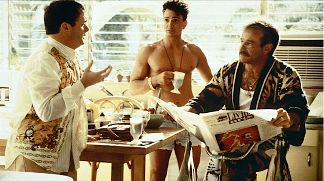 In “Birdcage,” Armand and Albert are successful enough to have a live-in housekeeper in Agador, although he’s more like a family member that a servant. Agador is perhaps the most flamboyant character in the film. He is of Guatemalan descent and wants to be a part of the couple’s drag show. So he frequently dons outlandish outfits and sings and dances as he does his chores. At one point, he cleans the pool in a thong. While mopping the kitchen one day, he dances to Gloria Estefan’s “Conga,” and wears cutoff shorts, a pink bra, a redhaired wig, a necktie, and a large flower on his left shoulder. When Armand wonders what he’s doing, Agador tells him he is a combination of Lucy and Ricky. In essence, he is auditioning for the show, but in reality, Agador’s drag performance gains a much wider audience with film viewers than he ever would have had in the nightclub.