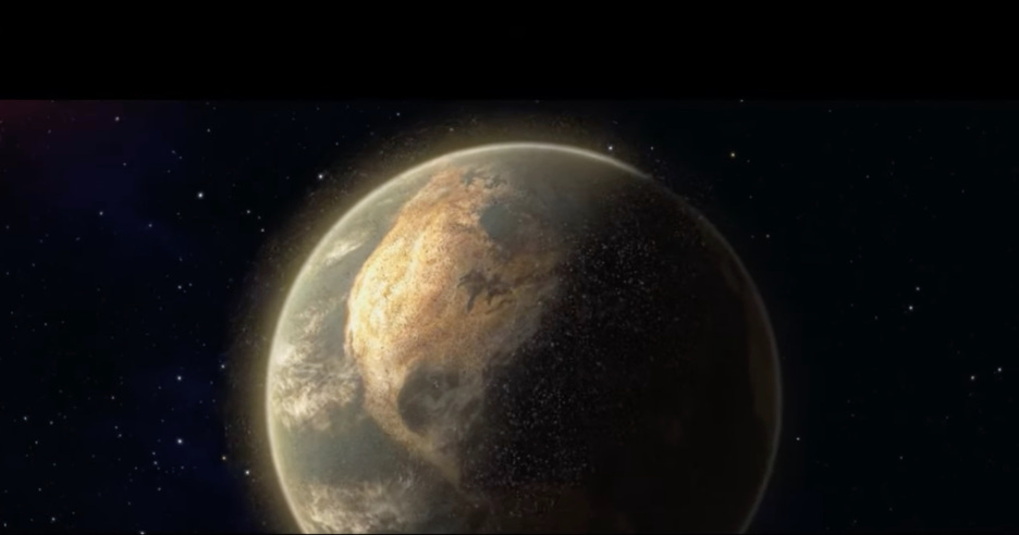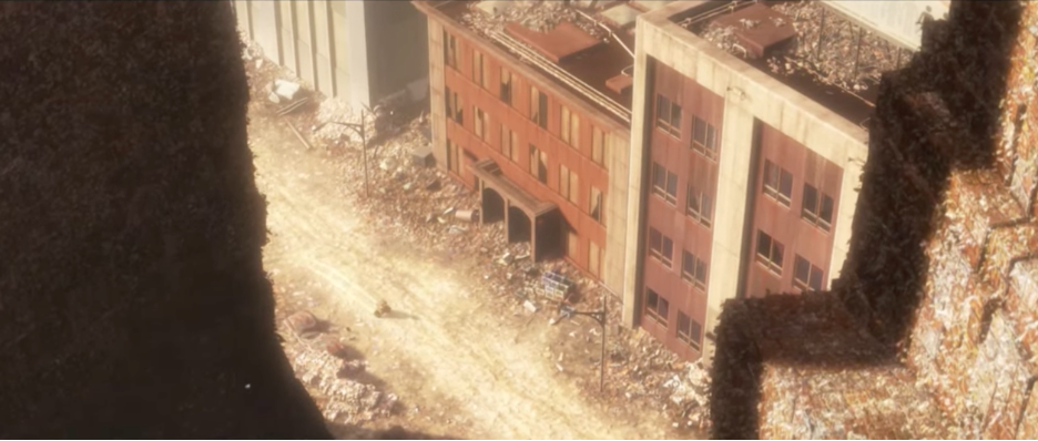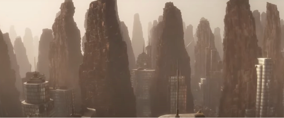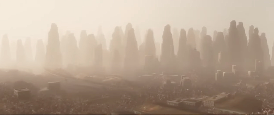 With the next phrasing of the song, we plummet precipitously toward New York City. This tune, becomes identifiable as “Put on Your Sunday Clothes” from the film “Hello, Dolly!” (1969), sung by Michael Crawford as Cornelius Hackl. But the exciting city Cornelius has been singing about is unrecognizable. We drift above it in a dusty atmosphere, through a maze of ruined skyscrapers, . . . or are they canyons?