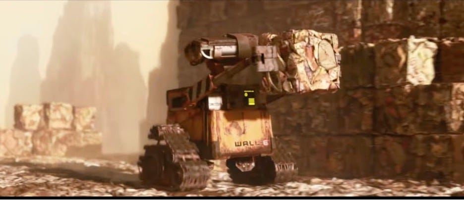 Little by little, we continue our descent to this barren location. And the symphonic show-tune now sounds tinny, as if played through a muffled speaker. We also become aware of wind blowing through an arid wasteland as a tiny vehicle maneuvers through some winding roads. And a remaining building is visible among what appears to be enormous amounts of trash. Then we find that the vehicle is actually a robot called WALL-E (Waste Allocation Load Lifter: Earth-Class) assigned to collecting and compacting the trash humanity left behind 700 years earlier. WALL-E is working as he listens to Cornelius’s song.